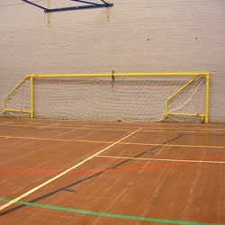 The sides fold in for easy storage with a simple autolocking pin - just press the arm down with your foot and fold the goal side arm in (no more split pins to lose or bend). The hinges need to fixed to the end walls of the sports hall.